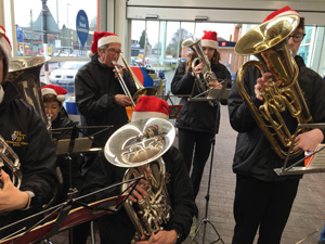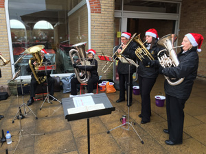Our most successful Music Cafe! Very enjoyable. Band members, family and friends made cakes to sell, served in the cafe and washed up/cleared up. We put out tables and chairs for the visitors. Before we started, we had to find more tables and chairs and were running out of room! The band played two sets from our Christmas programme, and ate cake! During the break members of our Learner Group and Training Band played four Christmas songs assisted by their regular helpers from the main band. 16th December - Carols at the Co-op, Holbeach