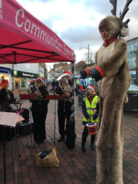 Second event of the day! A different group went to Spalding to play carols as part of the afternoon entertainment before thr town's lights were switched on. It was a very quiet afternoon - very few people around; we played for an hour from 3.00 to 4.00pm. Part of the entertainment was reindeer on stilts - so we got one of them to conduct a carol!