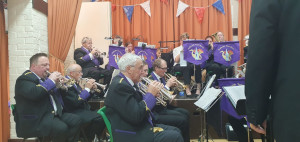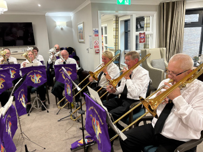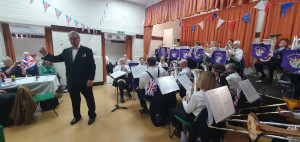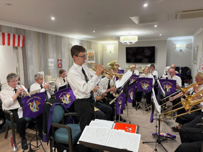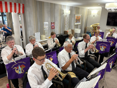 The Band made a return visit to The Meadows Care Home for its Summer Fayre. It was raining on and off so we played inside, but there was not a lot of room and it was very warm. We did not have any trombones of our own, so were grateful to be joined by Martin Oliver, Rob Norris and Heather Doubleday. Principal Cornet, Matthew Simons, played the cornet solo Spanish Eyes and played it very well.