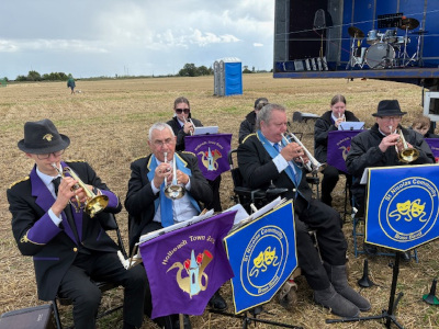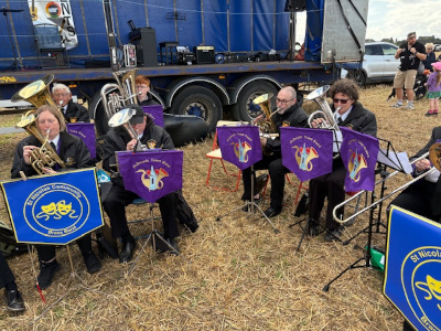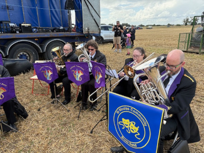 Spalding’s All Included Music Project (AIMP) were organising a stage at the Moulton Working Weekend, and part of the Harvest Festival Weekend. >We were invited to take part for a 45 minute set. After a lot of changes, we ended up playing jointly with St Nicolas Brass for an hour and a half. The event was at the ‘Working Field’ near Moulton. It was a very large field! In the distance we could see tractors working. We were in front of a stage; there were some bales for an audience but very few people. We had a break half way through during which there was a heavy shower. The stage was the back of a lorry with difficult access, so we set up in front.